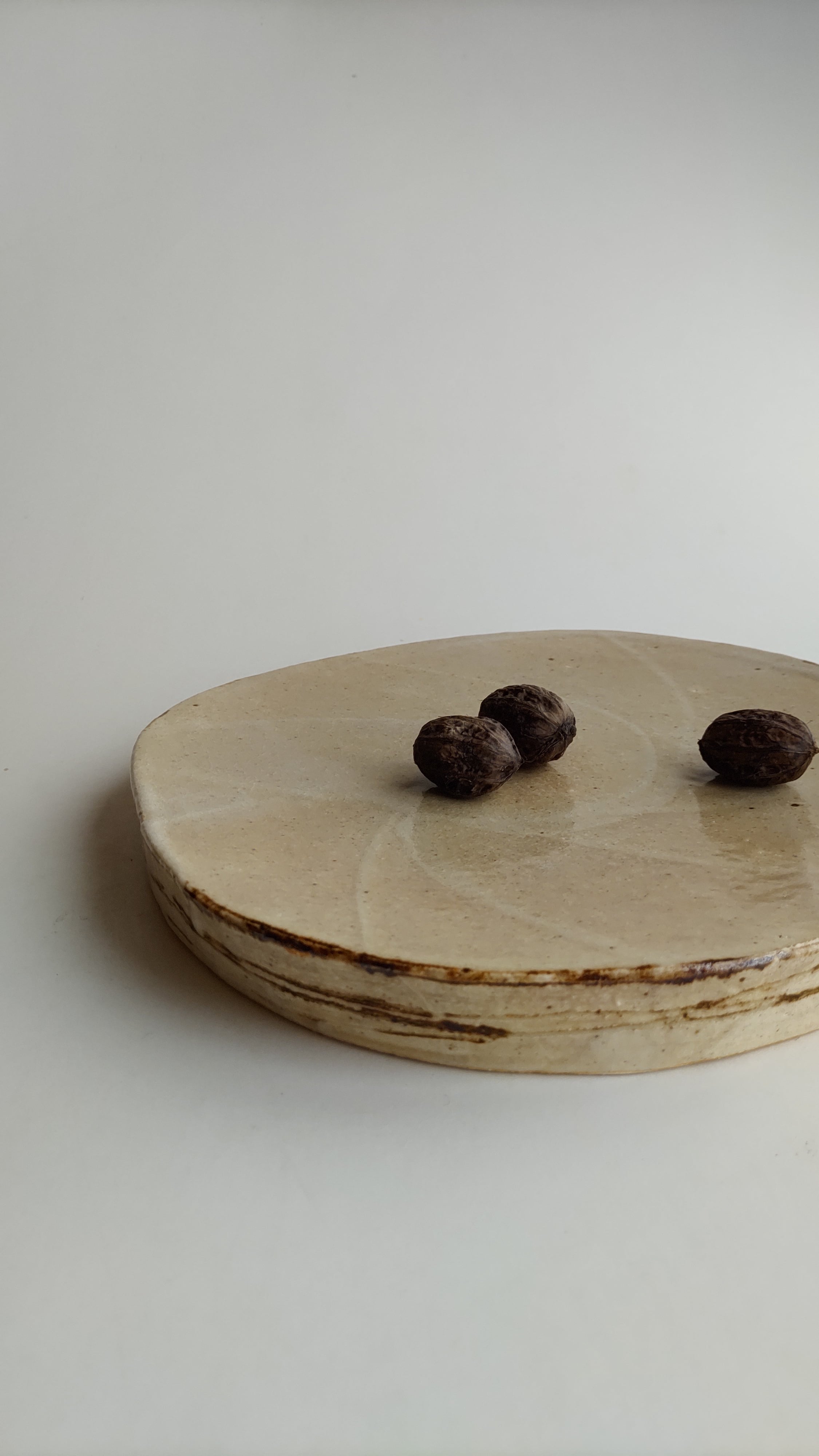 制作過程について、平らな面を下に制作し、窯に入れる時は反対にして焼いたのでややなだらかなカーブがついています。