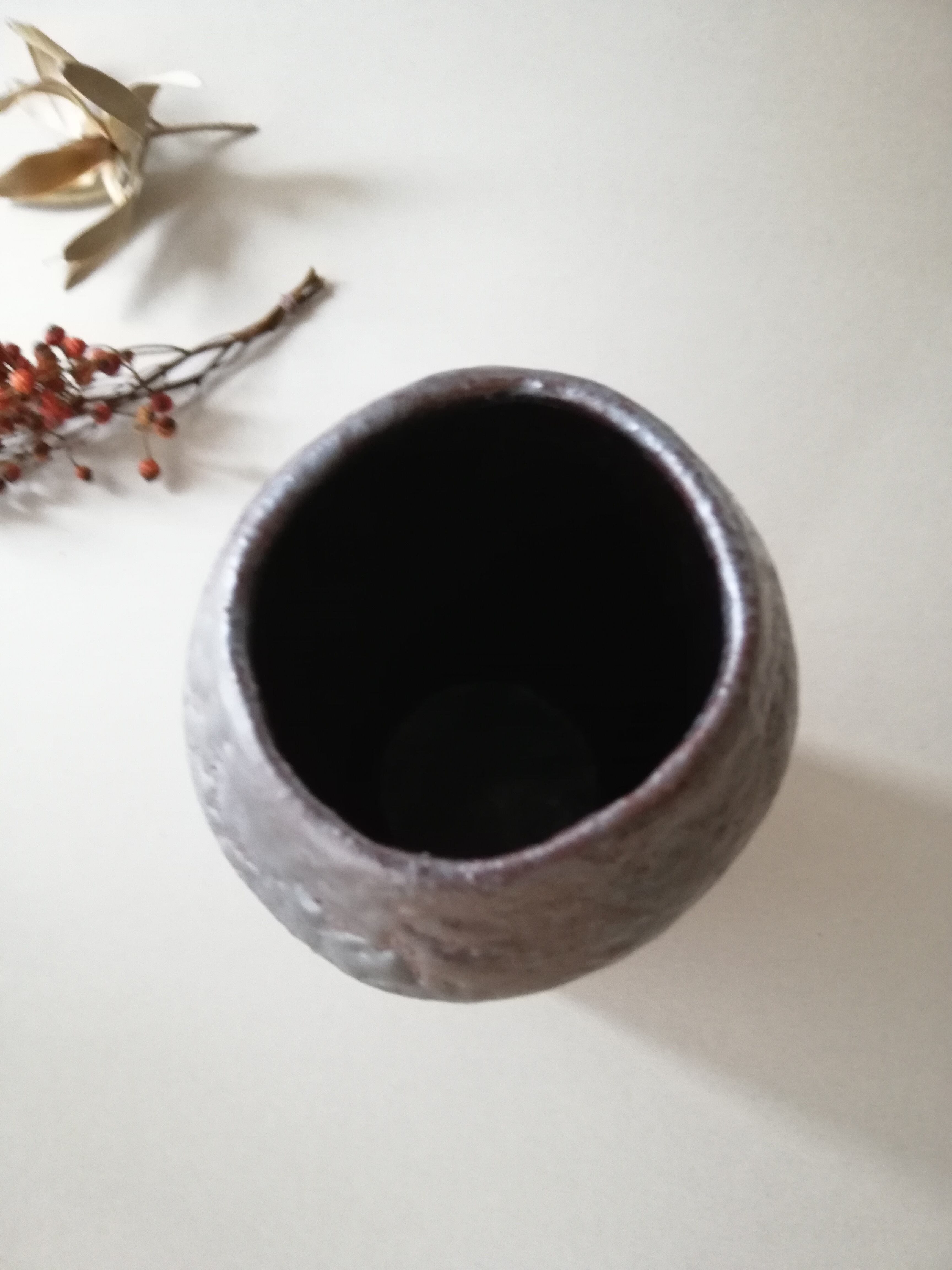 筒形に形作り口元は少し縮ませて、縦に線描きし、オリジナルの鉄の顔料を入れた灰釉をかけて仕上げました。