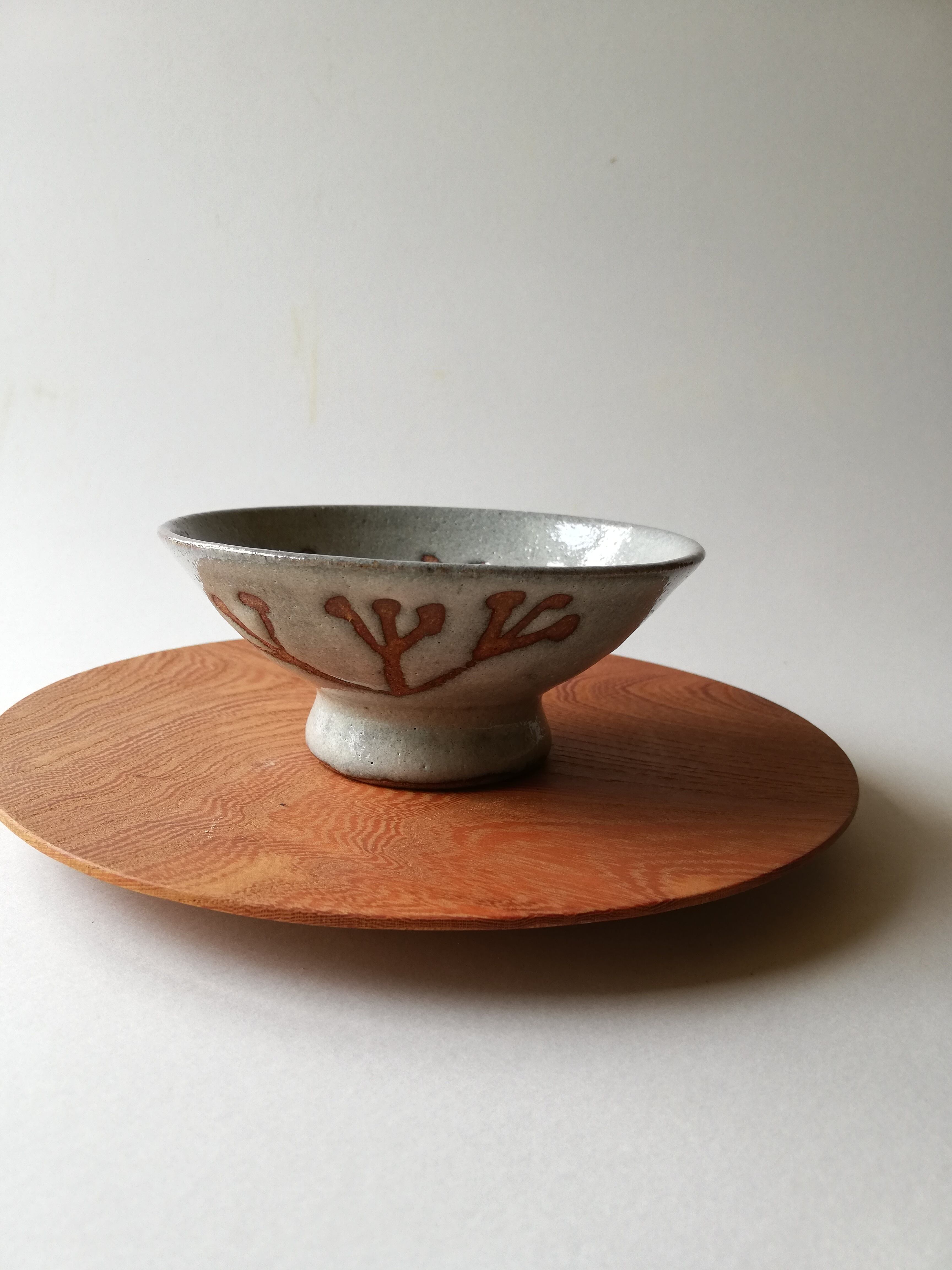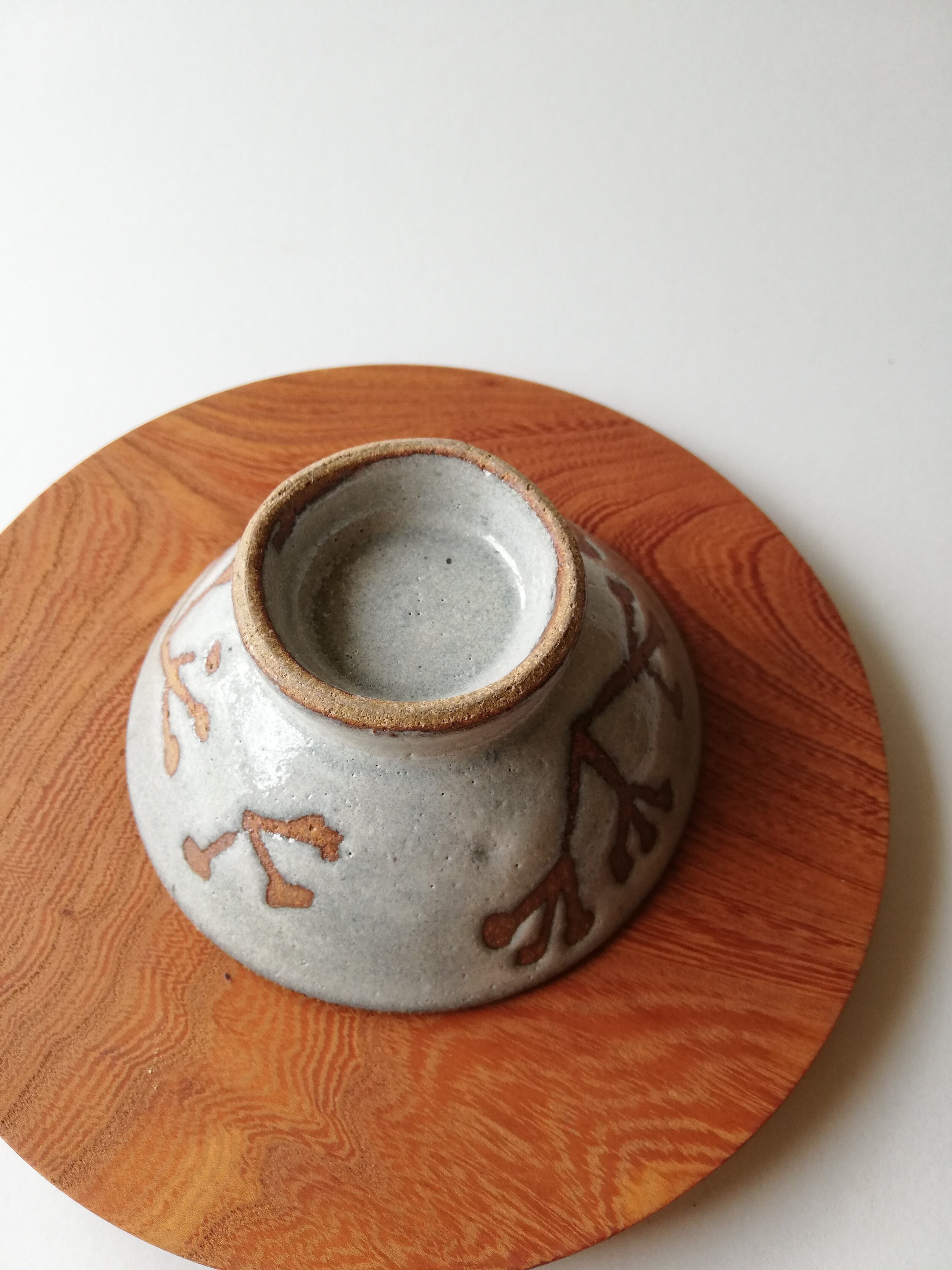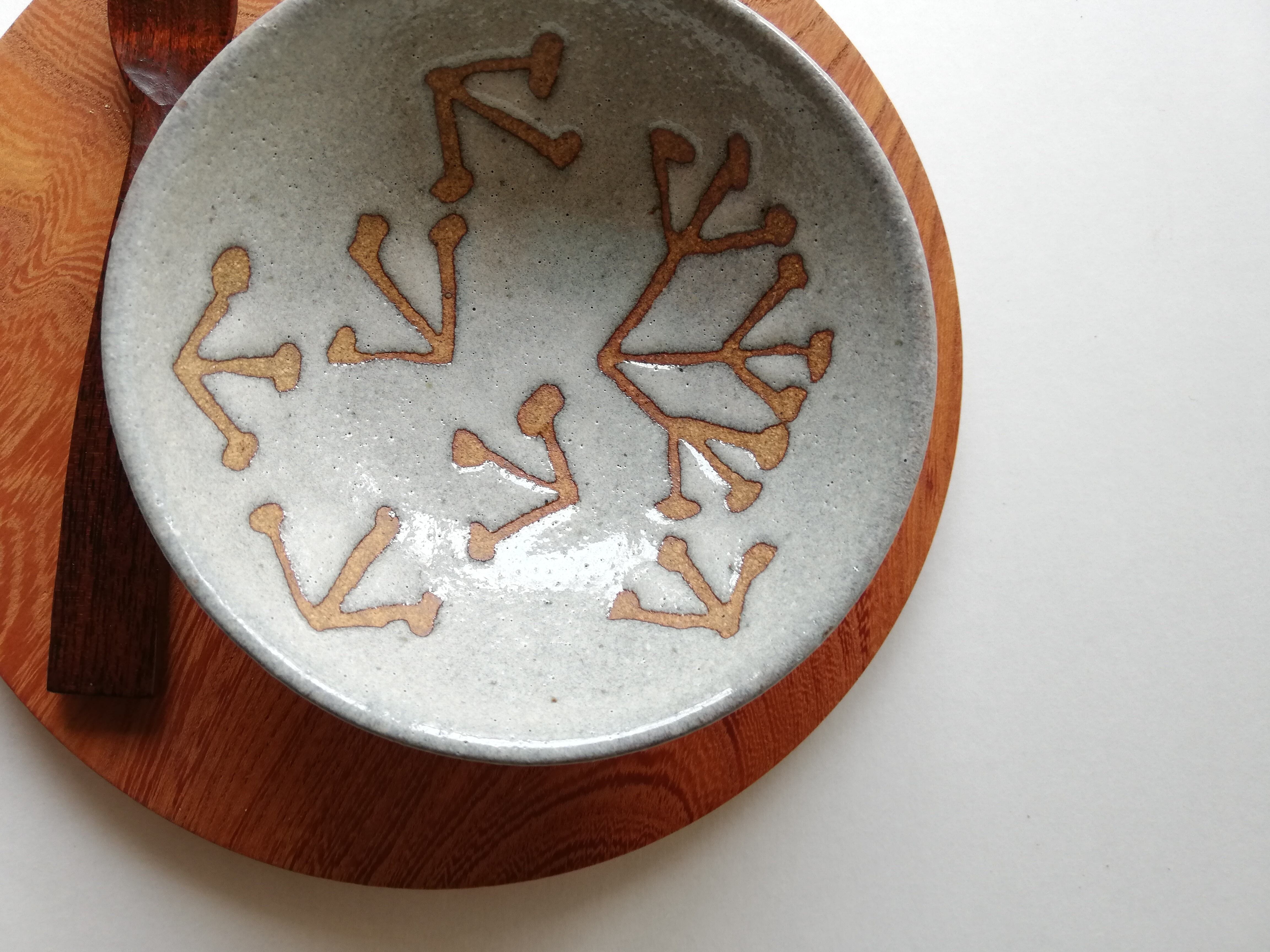 優しい色合いのベージュの土にみつまたの模様に蝋引きし、モミ殻ベースのうわぐすりのうのふ釉で仕上げました。