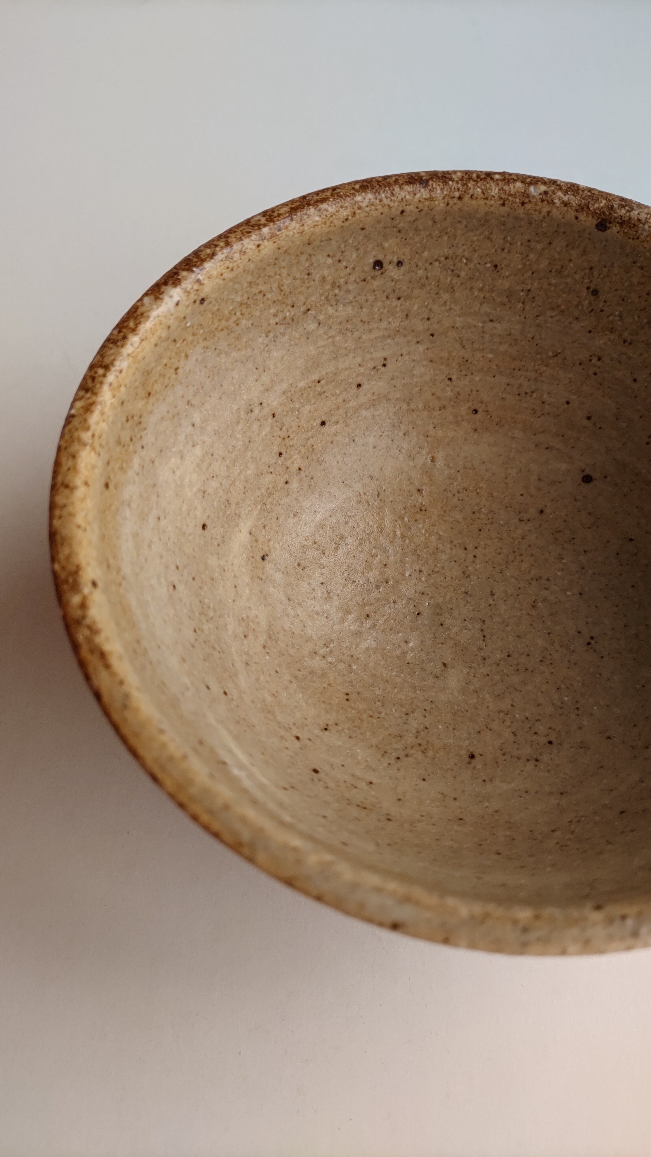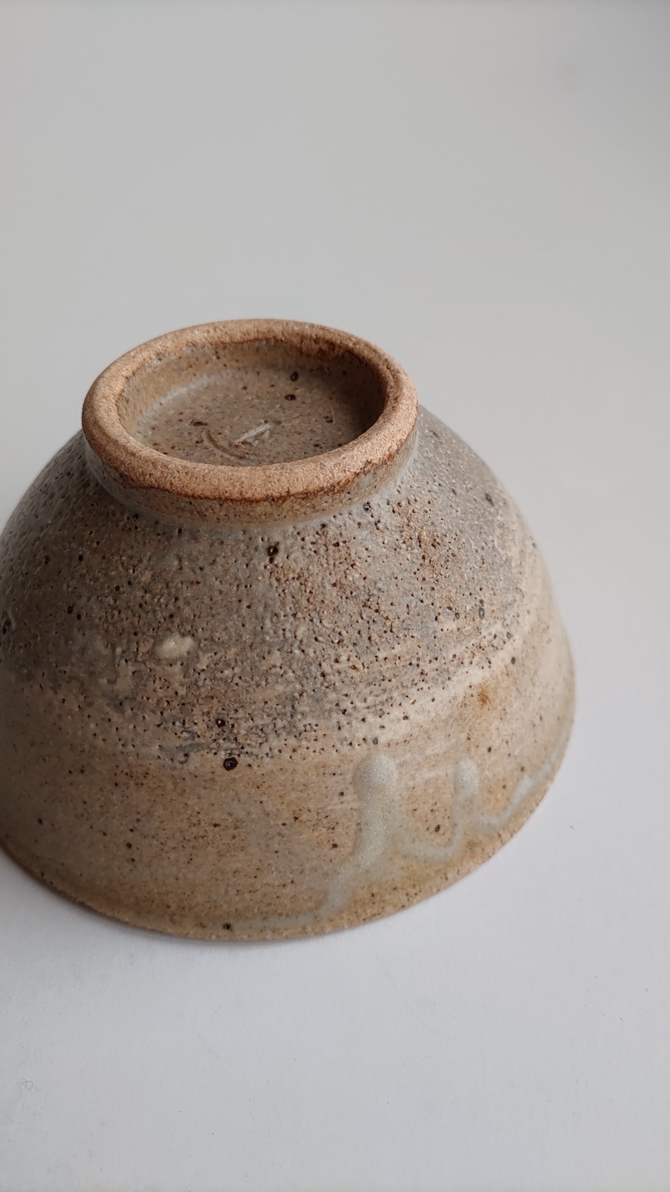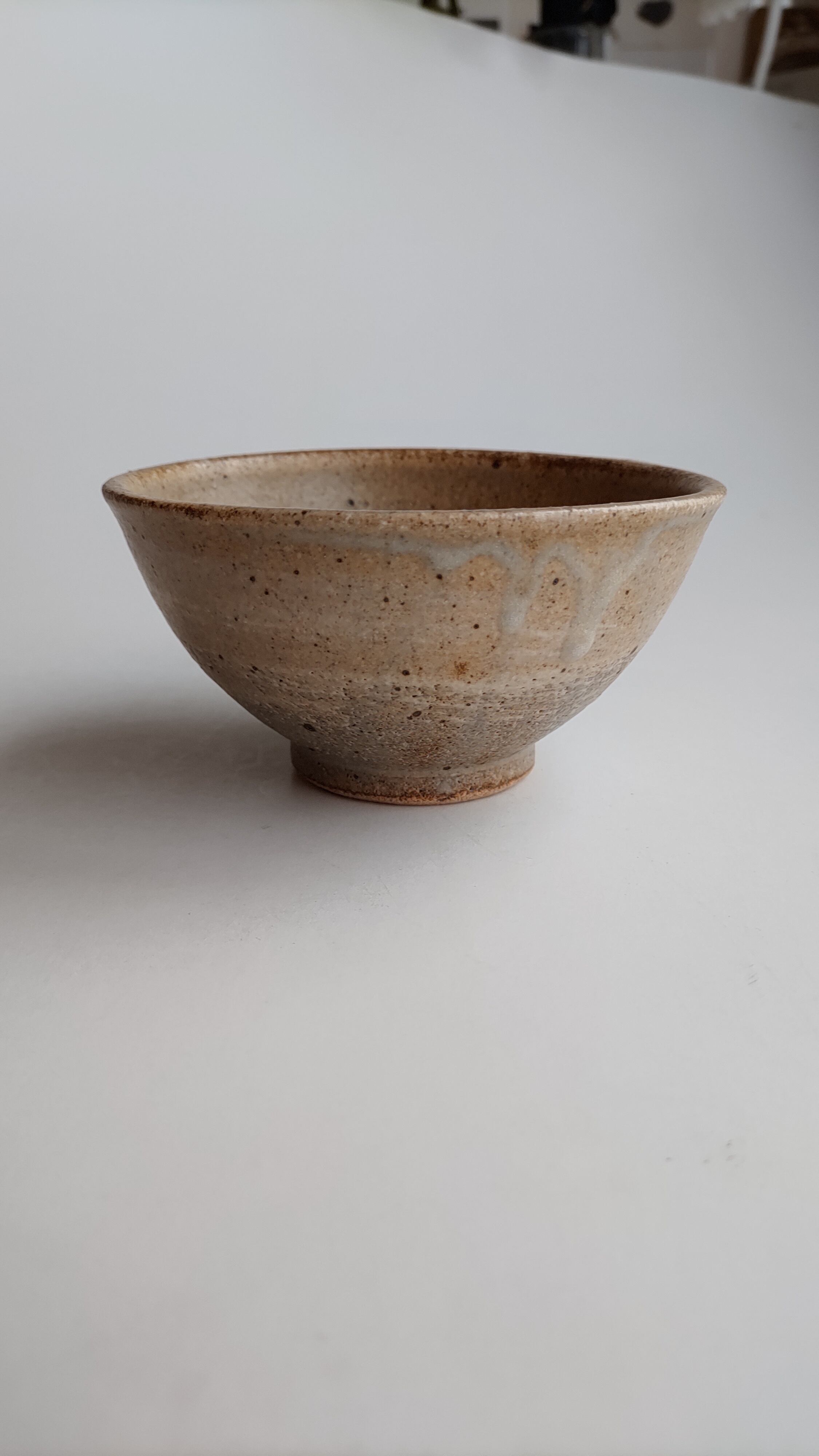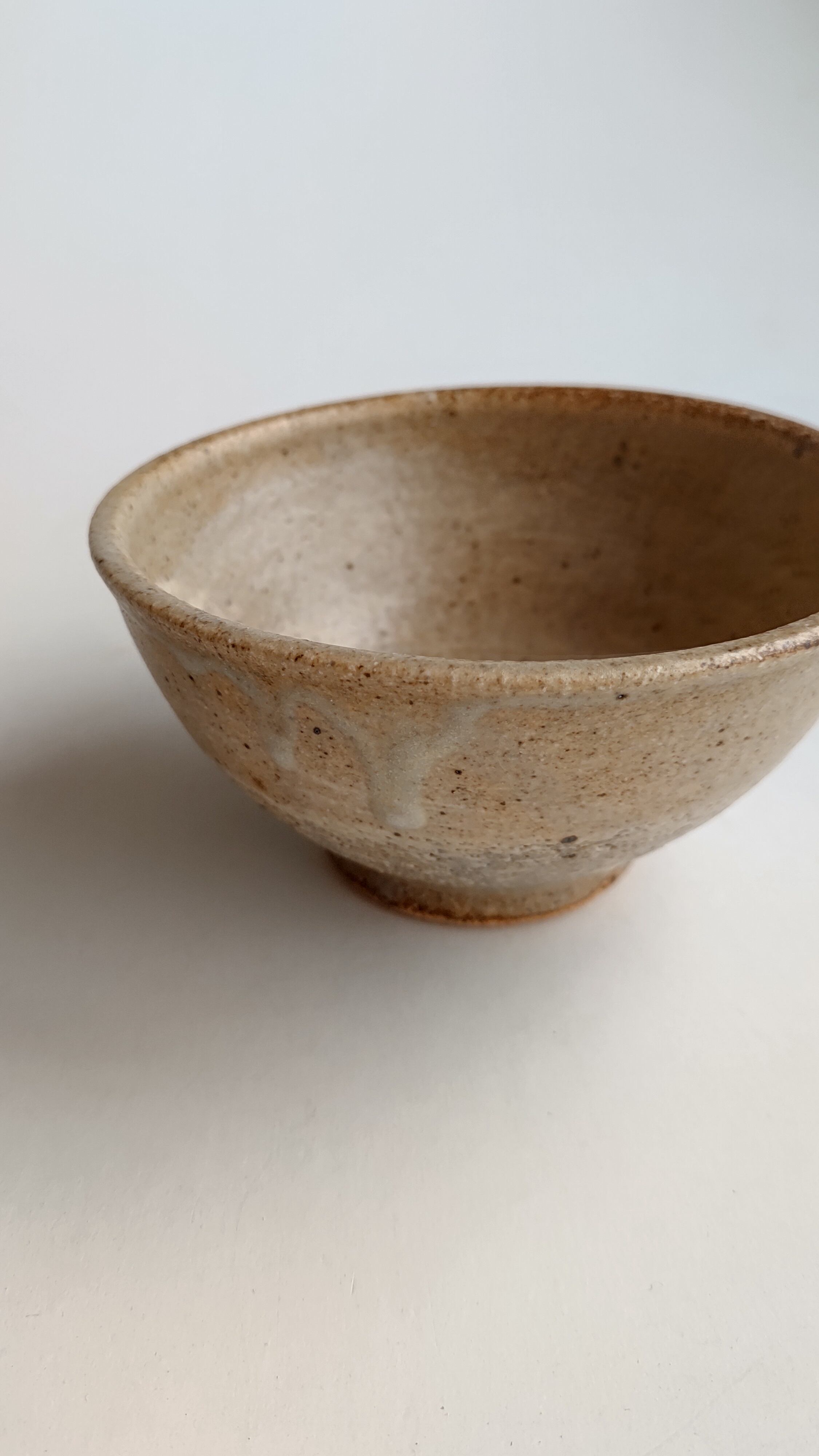 落ち着いた色合いのお茶碗、赤土に白化粧土をたっぷり塗り、マットの灰釉をかけて仕上げました。柔らかい色なので、ごはんが映えるお茶碗だと思います。