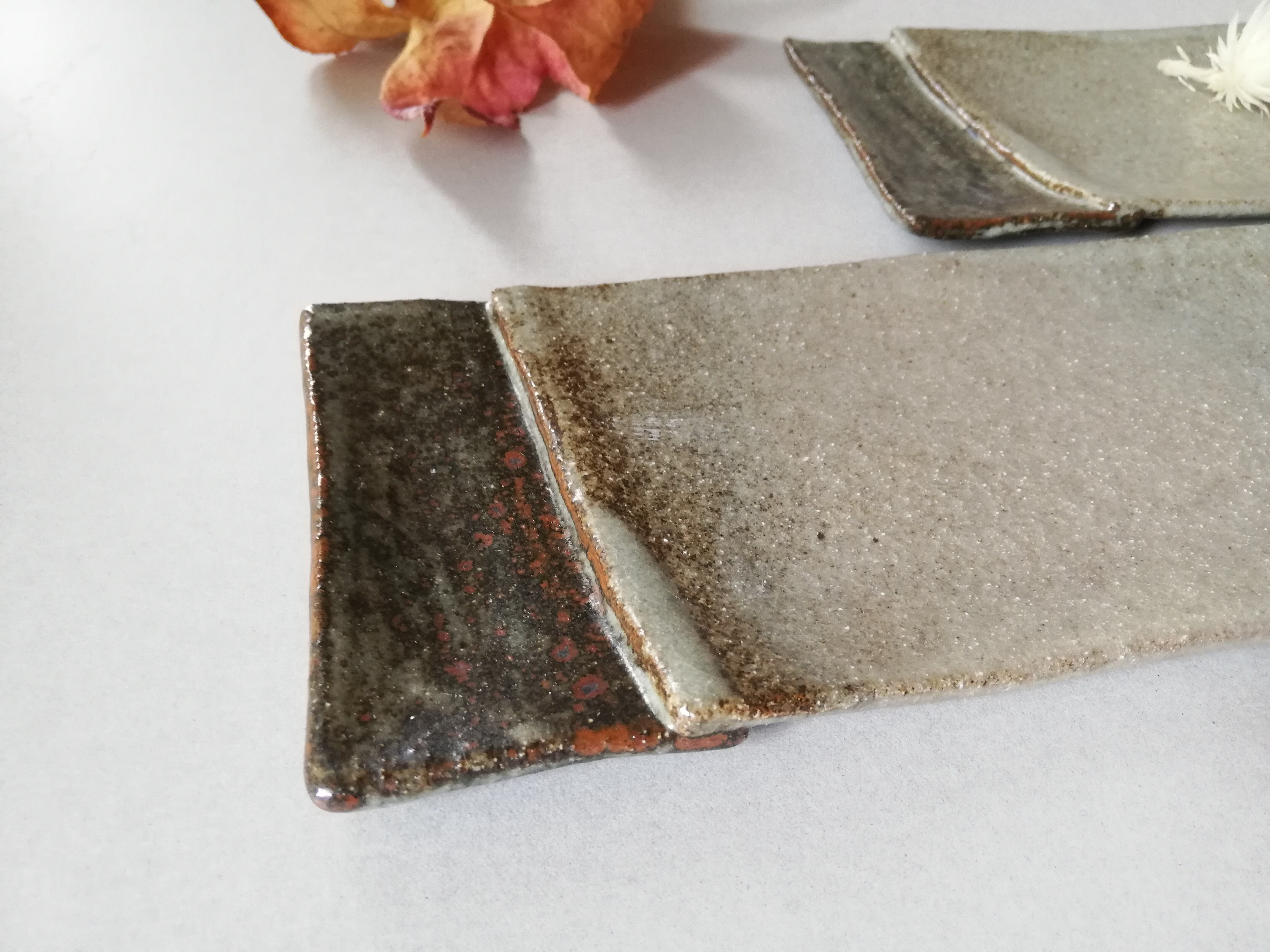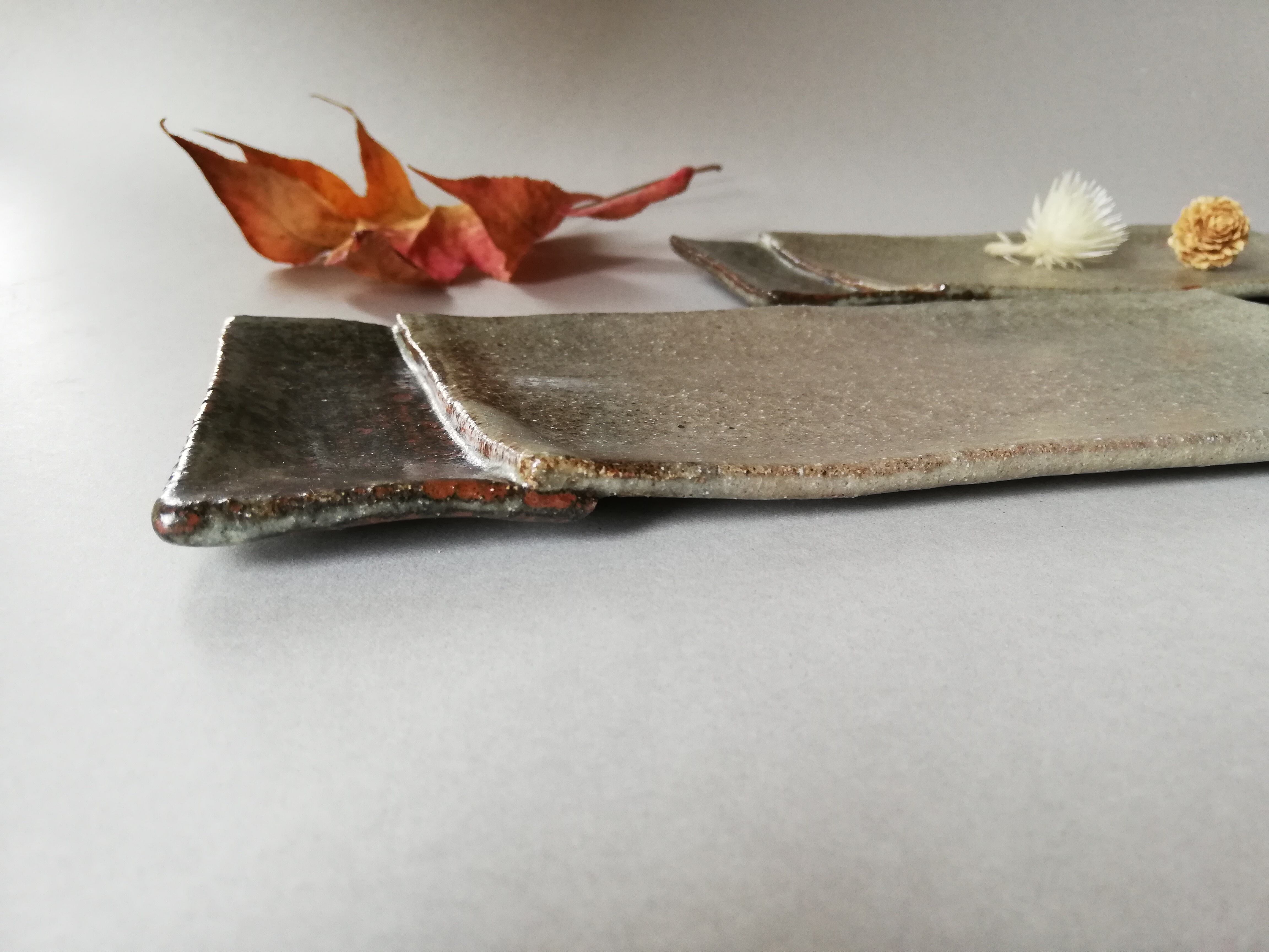 長方形の板状の土を一度カットし、張り合わせた長皿です。張り合わせた部分に顔料(鬼板)を塗り、そして釉薬がかかっています。