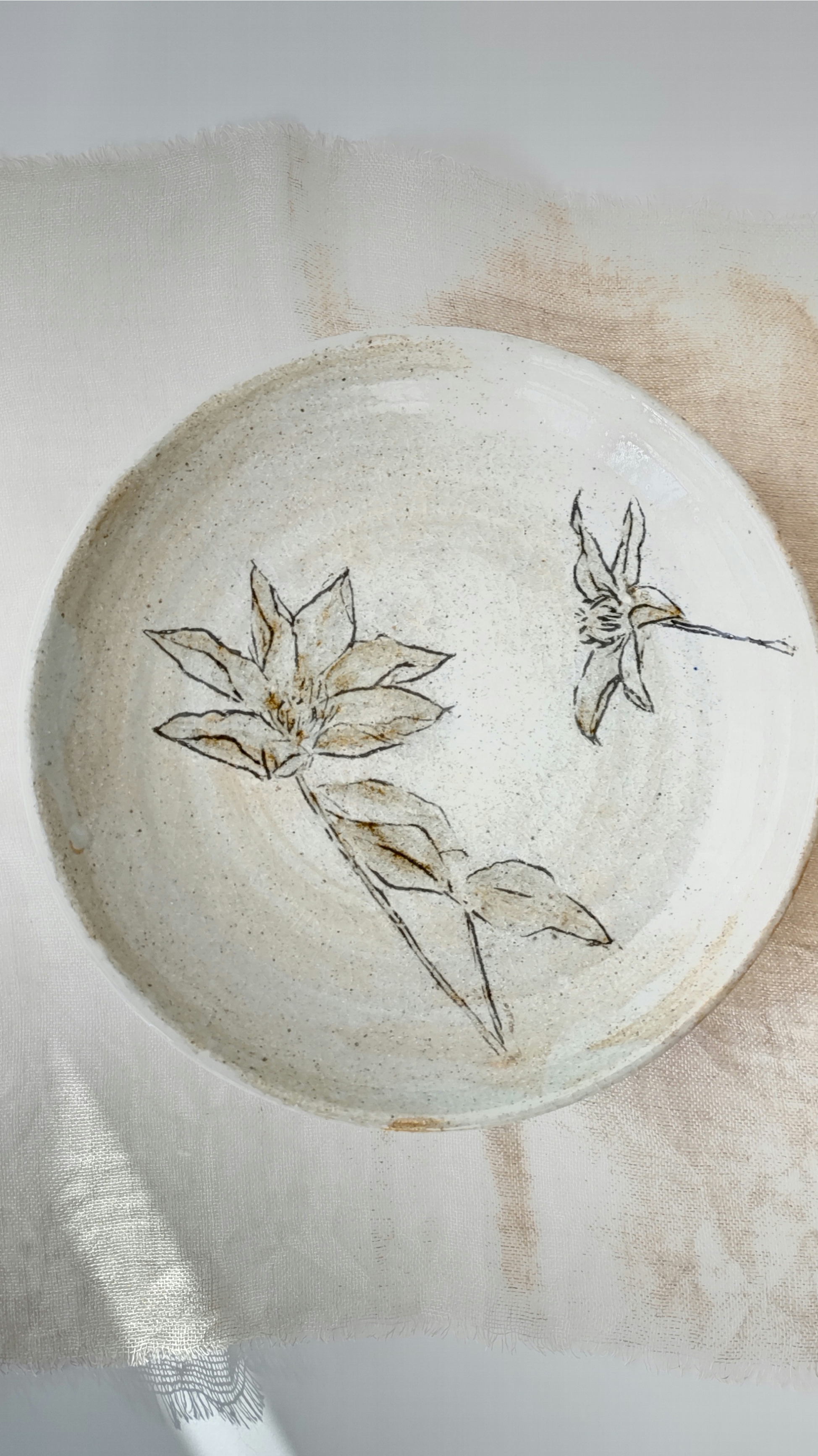 象嵌仕上げで鉄線を施し、透明のうわぐすりで仕上げた大皿。
