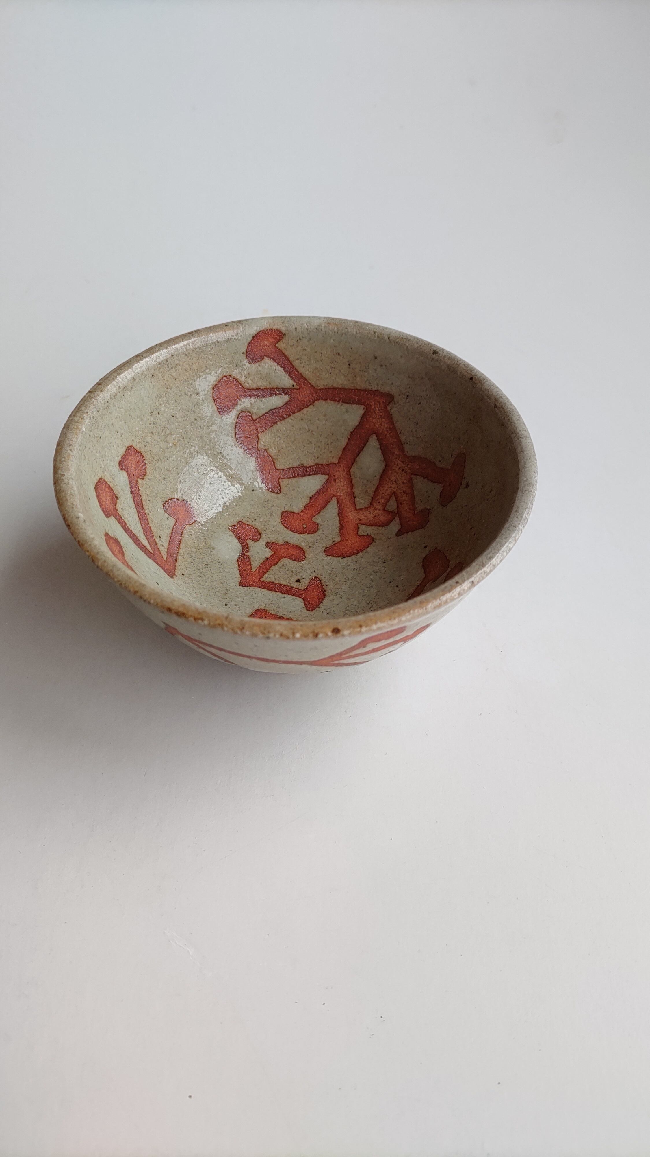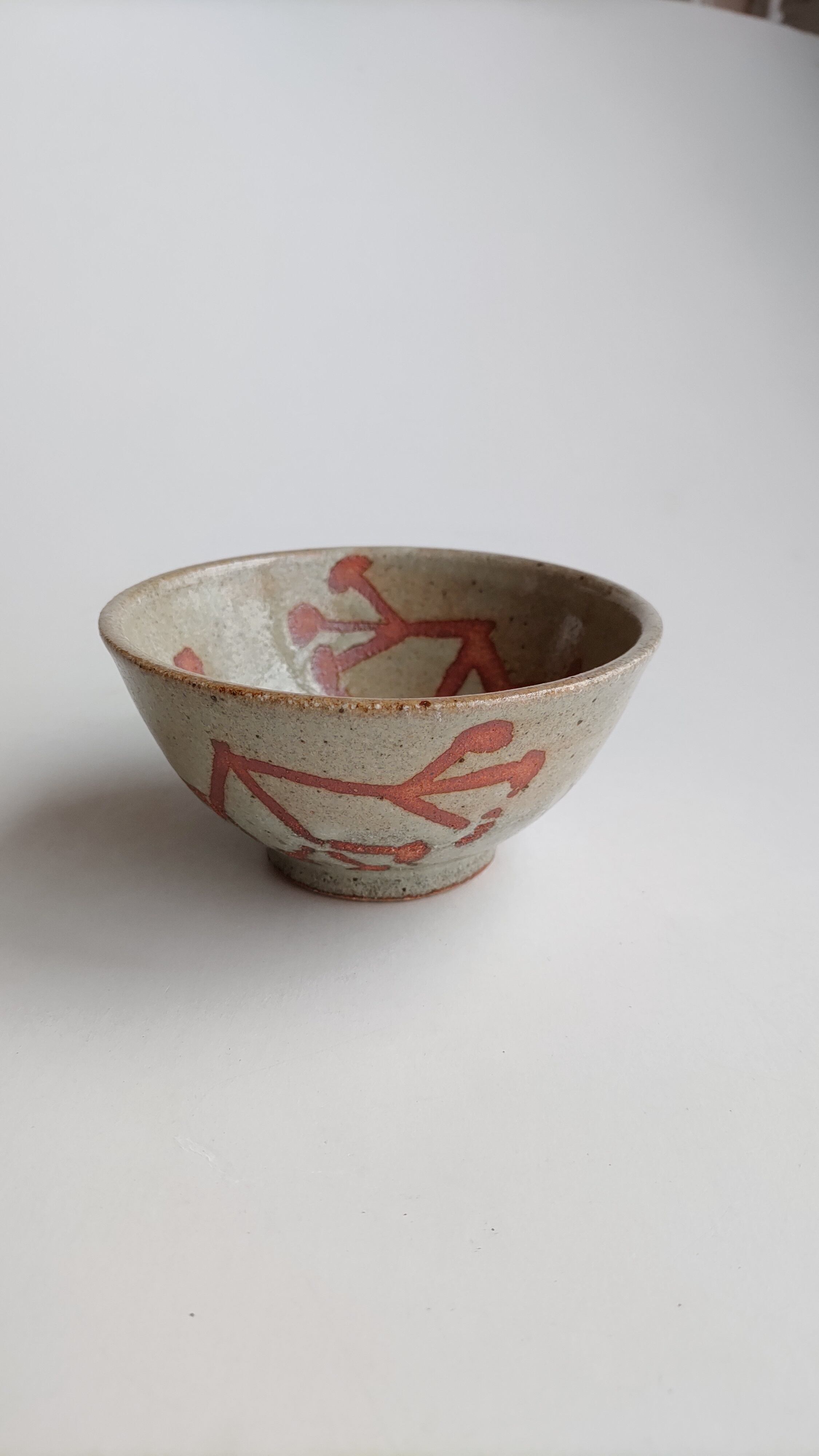 優しい色合いのベージュの土にみつまたの模様に蝋引きし、モミ殻ベースのうわぐすりのうのふ釉で仕上げました。ご飯が美味しく味わえるお茶碗です。